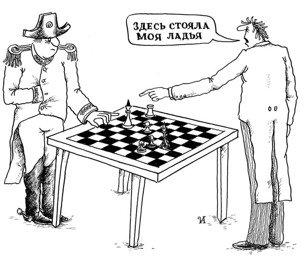 К Михаилу Талю, в бытность его чемпионом мира по шахматам,обратился его приятель, главный врач психиатрической больницы в Риге, с оригинальной просьбой — сыграть пару партий с одним из его больных, возомнившим себя чемпионом мира по шахматам. Сыграть, в смысле выиграть, чтобы излечить больного от мании величия.