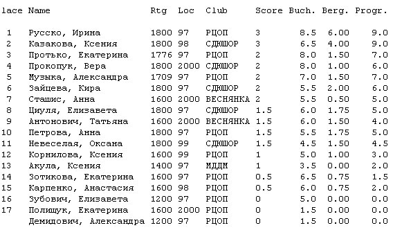 6.  Русско, Ирина     1  1800 15:W  5:W  9:W  2:L  4:D  1:L 13:L  7:D 16:W