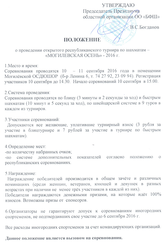 10-11 сентября в помещении Могилевской ОСДЮШОР (б-р Ленина, 6) пройдет открытый республиканский турнир по шахматам "Могилевская осень-2016".