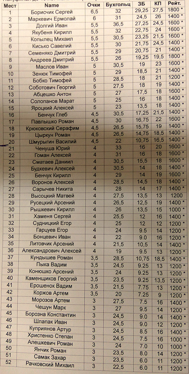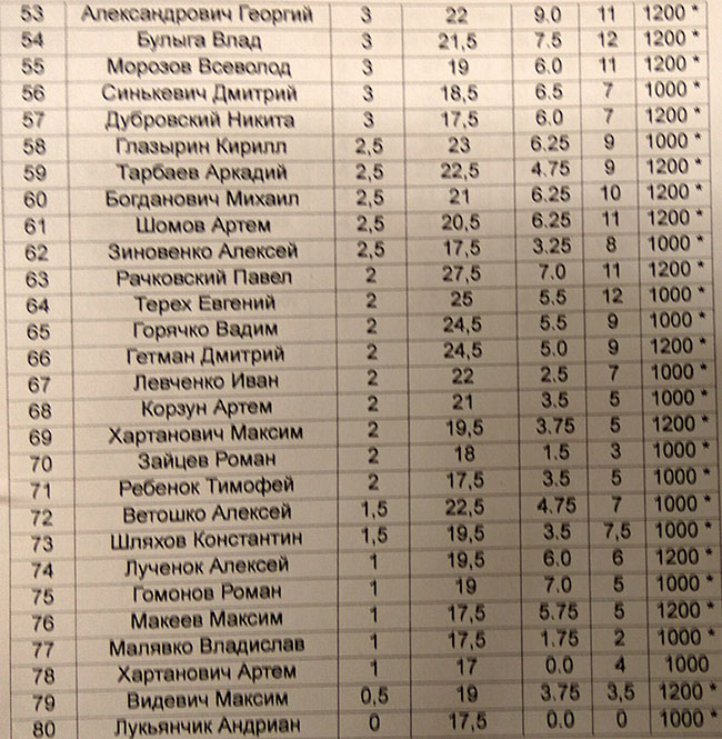 | 28 | Папко Тимофей | 2,5 | 25,5 | 7.25 | 12 | 1400 * |