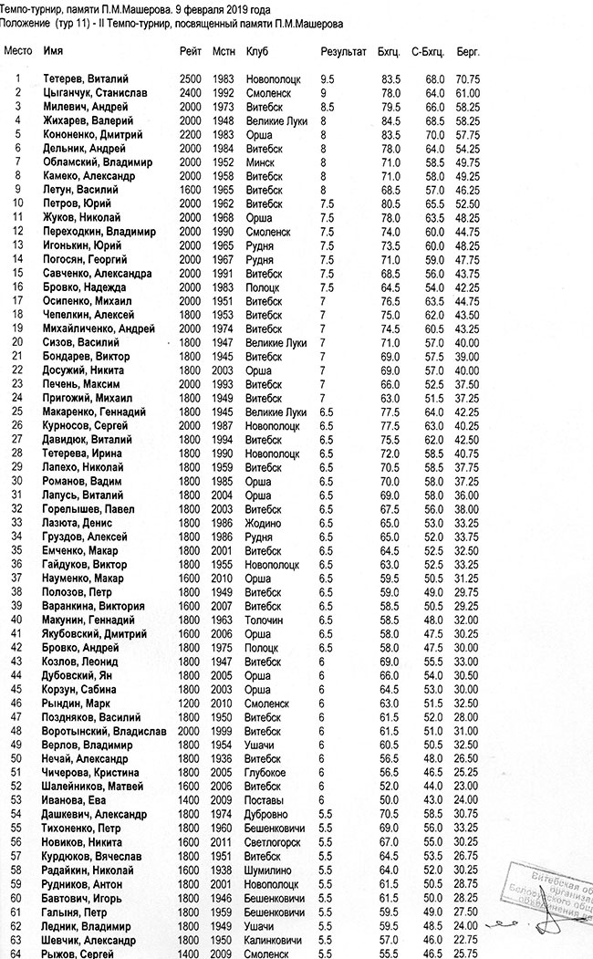 В итоге в ветеранской номинации тройка призеров состояла из кандидатов в мастера, набравших по восемь очков: победителем по лучшему коэффициенту признан 70-летний ветеран Валерий Жихарев из Великих Лук, вторым был Владимир Обламский из Минска, третьим Александр Камеко из Витебска.
