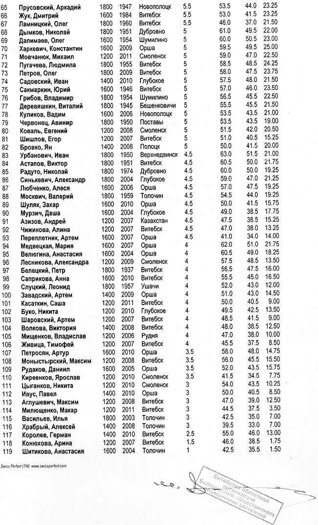 Среди школьников отличились, набравшие по 6.5 очков Науменко Макар (Орша), Варанкина Виктория (Витебск) и Рындин Марк из Смоленска (6.0). В другой возрастной категории отличились Иванова Ева (Поставы), Якубовский Дмитрий (Орша) и Новиков Никита (Светлогорск).
