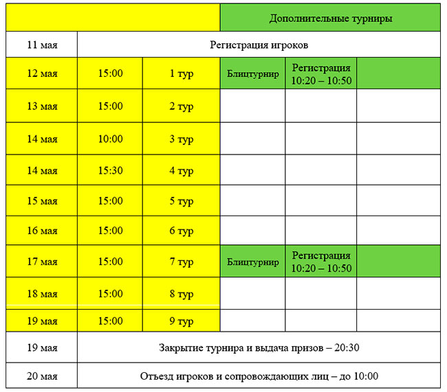 Стоимость проживания (место в двухместном номере), трехразового питания и участия в турнире для обладателей звания «международный гроссмейстер» и для обладателей звания «международный мастер» с рейтингом ФИДЕ 2500+ составляет 20 000 рублей