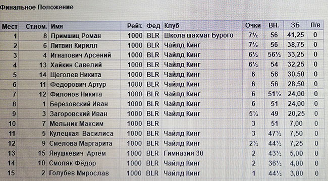 7 туров по швейцарской системе. Партии играются по правилам ФИДЕ. Контроль времени 15 мин+10 сек. на всю партию для каждого участника.