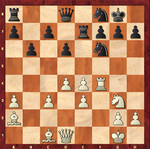 Разыгран не самый распространенный вариант, однако партии на такую тему уже были. В этой позиции белые ранее ходили 13. Qf3 и и мели неплохую статистику. Однако белорусский гроссмейстер подготовил сюрприз!