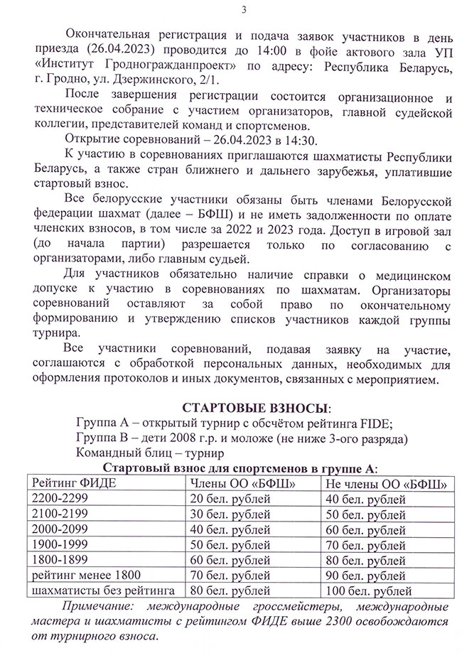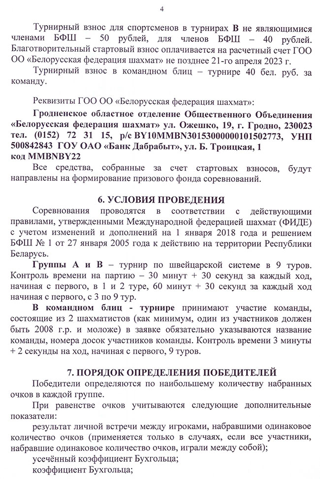 Благотворительный стартовый взнос оплачивается на расчетный счет ГОО ОО «Белорусская федерация шахмат» не позднее 21-го апреля 2023 г.
