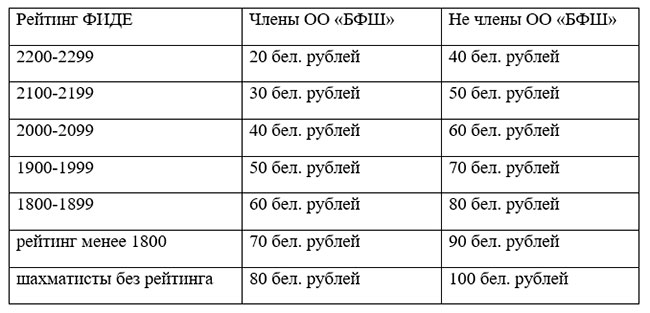 Турнирный взнос для спортсменов в турнирах B не являющимися членами БФШ – 50 рублей, для членов БФШ – 40 рублей.