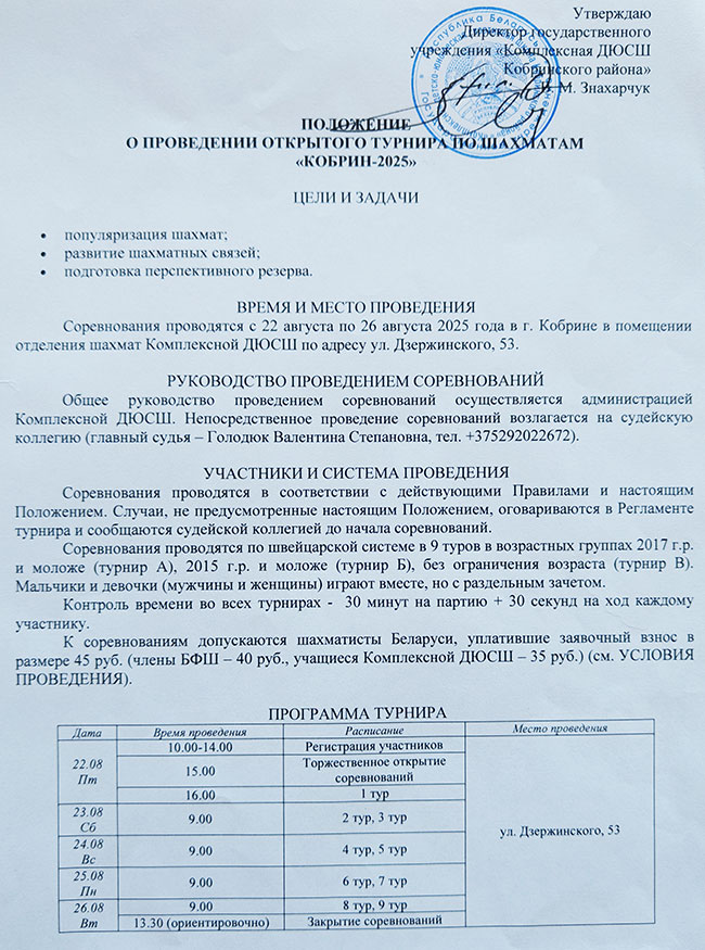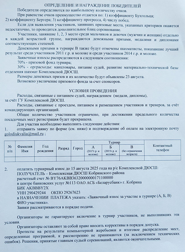 С 22 по 26 августа в помещении отделения шахмат Комплексной ДЮСШ (ул.Дзержинского, 53) пройдет открытый турнир по шахматам "Кобрин-2025".