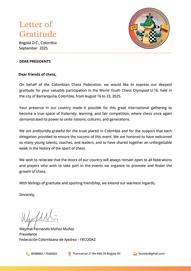 ОО "Белорусская федерация шахмат" также благодарит организаторов за гостеприимство и создание хороших условий для белорусской делегации.