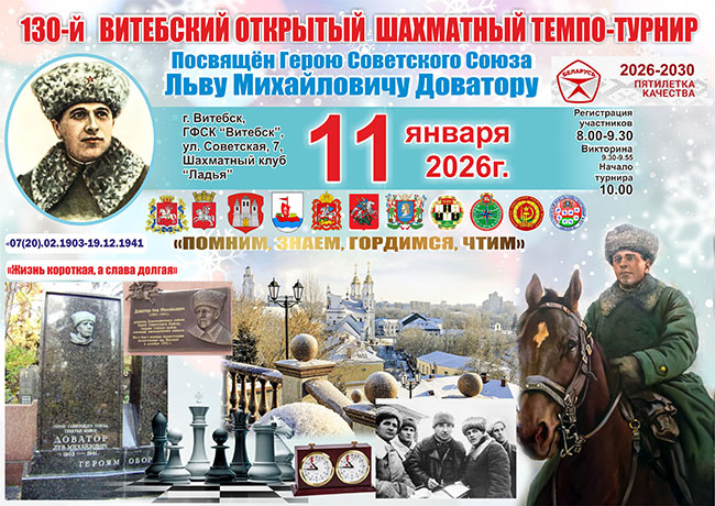 11 января Витебский областной совет ветеранов БООВ на базе шахматного клуба ГУ "ГФСК "Витебск" провел 130-й Витебский открытый лично-командный шахматный темпо-турнир, посвященный на этот раз Герою Советского Союза Льву Михайловичу Доватору, нашему земляку, уроженцу нынешнего Бешенковичского района. За последние 20 лет по количеству проведенных открытых шахматных турниров, организаторами которых постоянно выступает областной совет ветеранов, Витебск уже обошел известный город-курорт Гастингс, английскую неофициальную шахматную столицу. Он, кстати, проводит знаменитые во всем мире шахматные турниры с 1895 года.