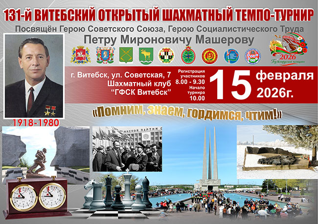 Темпо-турнир проводится 15.02.26 г. (воскресение) в 10.00 по адресу: г. Витебск ул. Советская 7, шахматный клуб ГФСК «Витебск» (регистрация с 8.00 до 9.30).