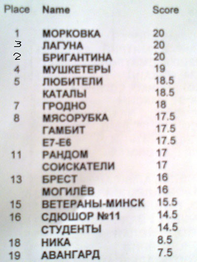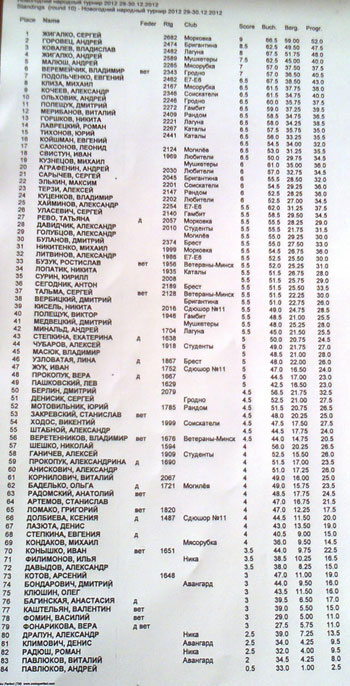 29-30 декабря в минской СДЮШОР №11 прошел "Новогодний народный турнир" на призы ООО "Внешевросервис". 84 участника, в том числе и представители белорусской шахматной элиты, играли по швейцарской системе в 10 туров. В результате в призовую шестерку вошли Сергей Жигалко, Андрей Горовец, Владислав Ковалев, Андрей Жигалко, Андрей Малюш и Владимир Веремейчик. Кроме того, призы получили по тройке лучших среди женщин, ветеранов, а также лучшие в своих рейтинговых группах. В командном зачете победила ведомая лучшим шахматистом страны "Морковка" (С. Жигалко, Рево, Никитенко). В тройке также "Бригантина" (Горовец, Сарычев, Вербицкий) и "Лагуна" (Ковалев, Горшков, Минальд). На закрытии организатор объявил о своих дальнейших планах, среди которых и увеличение числа призов и призового фонда.Итоговая таблица:
