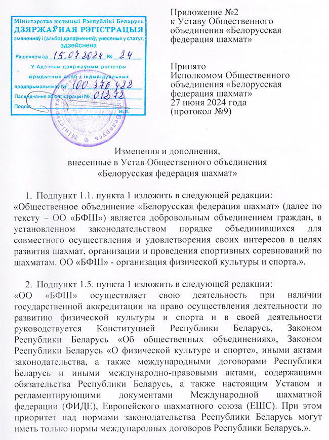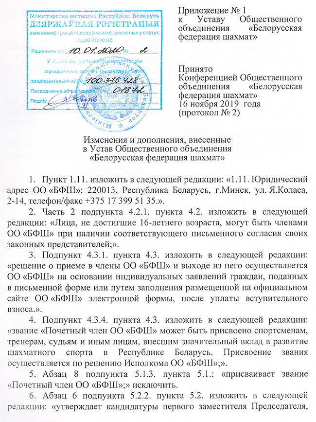 1.6. ОО «БФШ» является членом ФИДЕ, ЕШС, а также в соответствии с учредительными документами может участвовать в создании на территории иностранных государств международных общественных объединений, союзов, вступать в международные общественные объединения, союзы, созданные на территории иностранных государств. ОО «БФШ» может поддерживать прямые международные контакты и связи, заключать соответствующие соглашения и осуществлять иную деятельность, не противоречащую законодательству Республики Беларусь, в том числе международным договорам Республики Беларусь.
