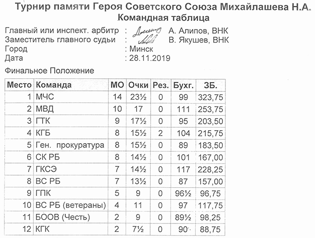 За остальные призовые места развернулась ожесточенная борьба, где все решил финиш. Перед последним туром по 8 командных очков имелось у Министерства внутренних дел и Государственного таможенного комитета, по 7 у Следственного комитета и Государственного комитета судебных экспертиз, и эти же команды составили пары последнего тура: МВД-ГКСЭ, ГТК-СК. МВД уверенно переиграло прошлогодних чемпионов, и с нетерпением стало ждать окончание второй встречи, которая не выявила победителей. МВД – второе, ГТК – третье, четвертыми стали, проявив несгибаемый характер, команда хозяев – КГБ. И немного о личном турнире, в котором свой высокий класс подтвердил Виталий Мерибанов, набрав 8.5 очков из девяти возможных, он заслуженно победил, второе место занял автор этих строк, а вот за третье место развернулась ожесточенная борьба, и двое спортсменов набрали одинаковое количество очков, но как говорят, дома и стены помогают. Чуть лучшие дополнительные показатели, и соответственно третье место у ветерана команды КГБ – Владимира Обламского, немного не повезло представителю команды чемпионов Валентину Ежелю.