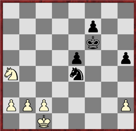 Вот, например, не очень сложный коневой эндшпиль. Понятно, что у белых огромный перевес, который осталось лишь четко реализовать. Я делаю 41. b4 (первый контроль пройден, на часах чуть более получаса). Ответ соперника 41…Кре6, 42. Кb6? И если бы черные ответили 42… Кс3!, то могло бы последовать 43. Крb2 — Kd1, 44. Крb3 — f5 c позицией, которую очень трудно реализовать, хотя, конечно, белые ни чем не рискуют. А вот если бы на 42 ходу я сыграла с4!? с последующей активизацией короля и движением пешек, то спасти позицию черным было бы очень трудно. Однако самым четким человеческим планом реализации перевеса был ход 41. Кb6, с дальнейшим движением отдаленной проходной. У меня же получилась какая-то смесь планов, в результате чего я потеряла темп игры, тем самым дав черным дополнительные возможности.