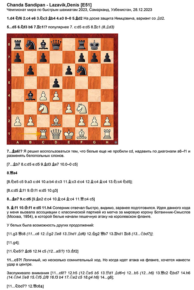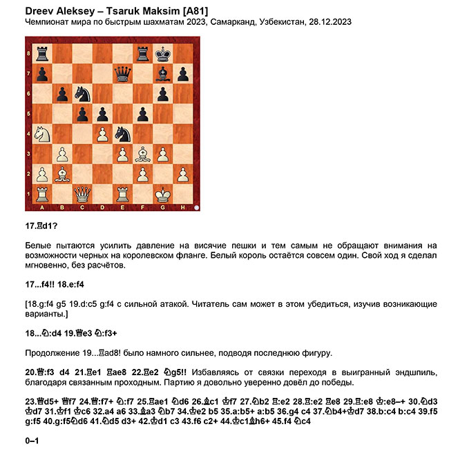 На финише удалось как-то выиграть три партии подряд. В последней партии я играл с чемпионом Европы 2023 года, Алексеем Сараной. Зная, как и что он обычно играет, планировал завершить партию мирным результатом, а он сыграл по-другому, завязалась борьба. Он пожертвовал ферзя. Играли-играли и я его переиграл.