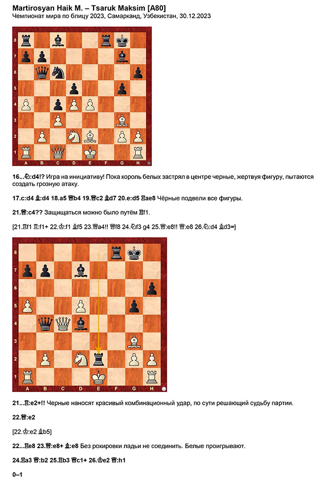 Партия с Аиком Мартиросяном, прошлогодним бронзовым призером, принесшая мне еще одно очко, может похвастаться изобилием красивой тактики.