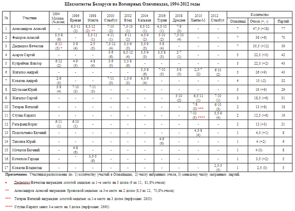 Предлагаем Вашему вниманию сборные таблицы участия наших спортсменов во Всемирных шахматных Олимпиадах за суверенную сборную Беларуси: