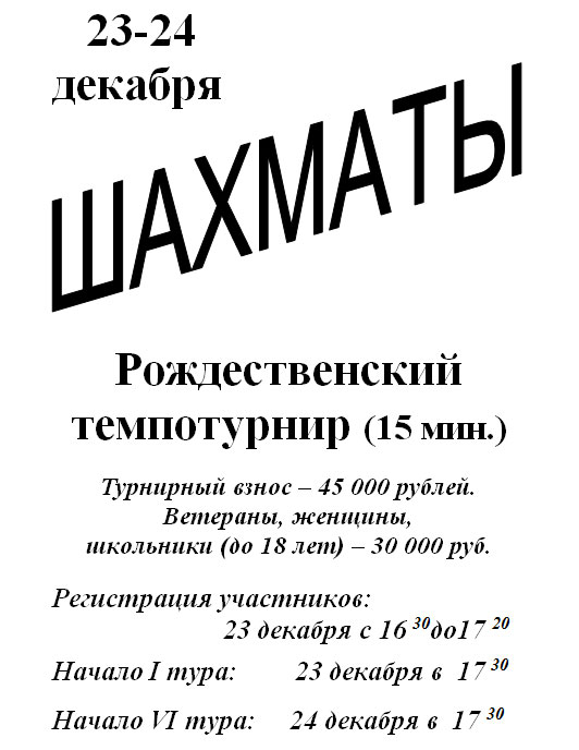23-24 декабря в Республиканском центре олимпийской подготовки по шахматам пройдет Рождественский темпотурнир.