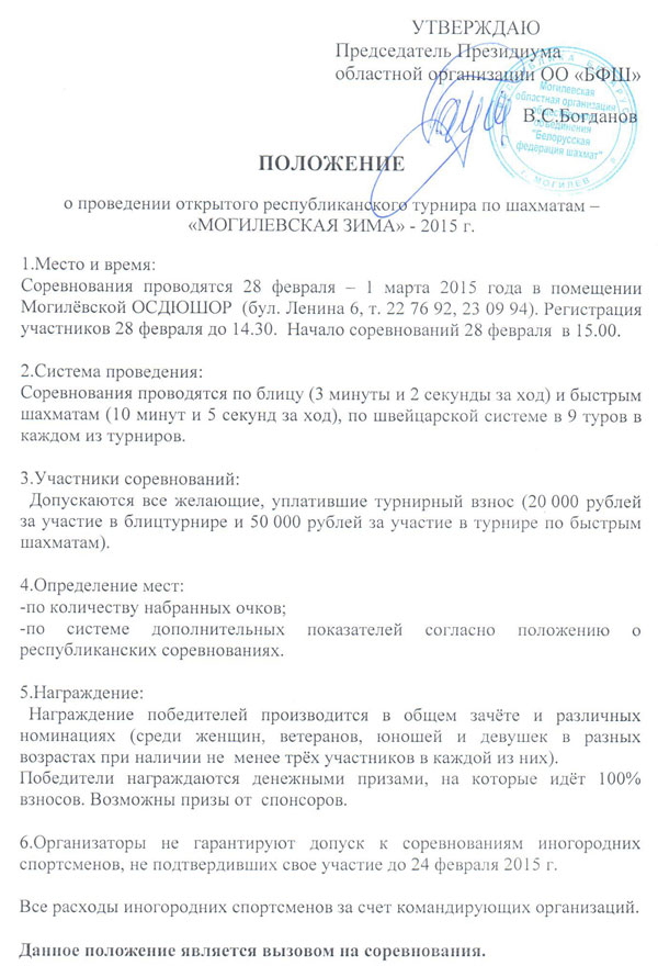 С 28 февраля по 1 марта в помещении Могилевской ОСДЮШОР пройдет открытый республиканский турнир по шахматам "Могилевская зима-2015".