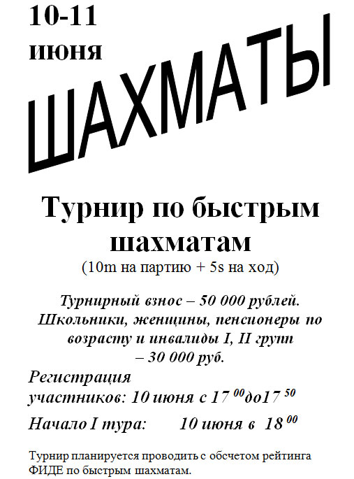 10-11 июня в минском РЦОПе проходит очередной турнир по быстрым шахматам. Турнир проводится с обсчетом рейтинга ФИДЕ по быстрым шахматам.