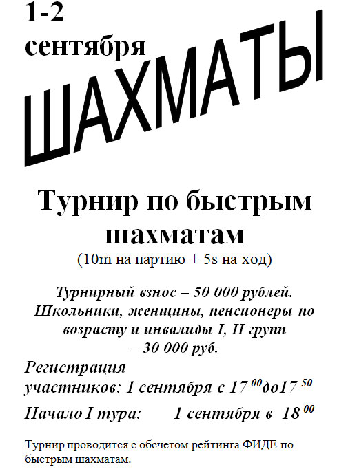 1-2 сентября в Республиканском центре олимпийской подготовки по шахматам и шашкам (ул.К.Маркса, 10) состоится турнир по быстрым шахматам с обсчетом рейтинга ФИДЕ. Приглашаются все желающие!