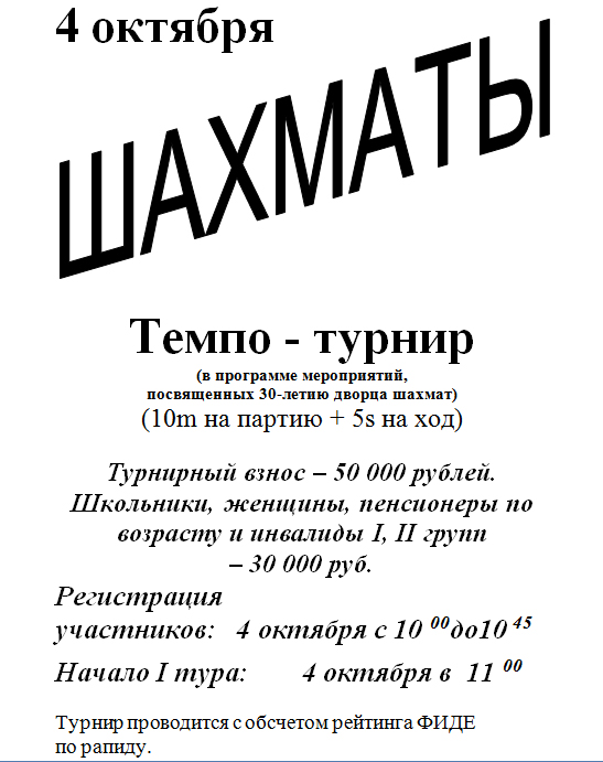 4 октября в Республиканском центре олимпийской подготовки по шахматам и шашкам состоится темпо-турнир с обсчетом рейтинга ФИДЕ по рапиду.