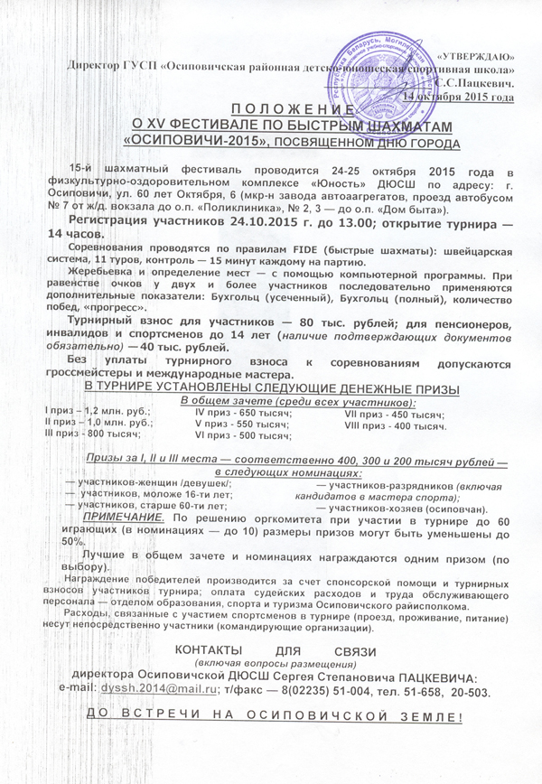 15-й шахматный фестиваль проводится 24-25 октября 2015 года в физкультурно-оздоровительном комплексе «Юность» ДЮСШ по адресу: г. Осиповичи, ул. 60 лет Октября, 6 (мкр-н завода автоаагрегатов, проезд автобусом № 7 от ж/д. вокзала до о.п. «Поликлиника», № 2, 3 — до о.п. «Дом быта»).