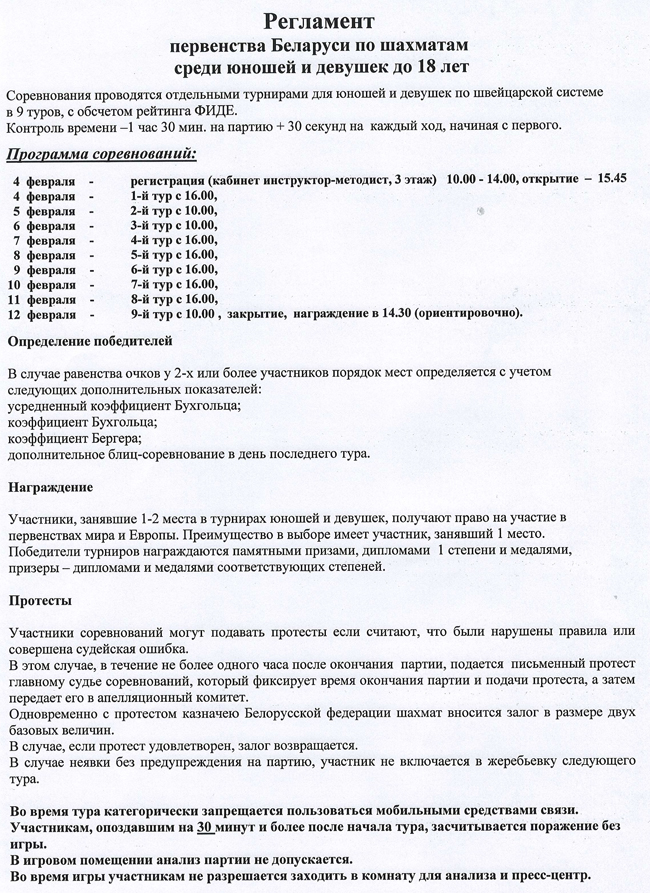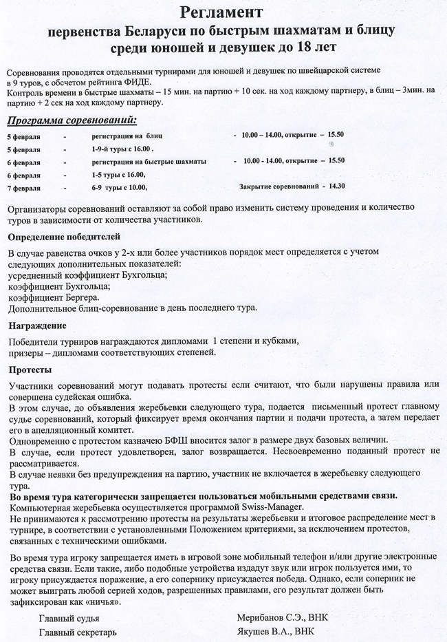 С 4 по 12 февраля в минском РЦОПе проходили первенства Беларуси среди юношей и девушек до 18 лет (классика), а также первенства по быстрым шахматам и блицу (5-7 февраля).Итоговые результаты по быстрым шахматам (юноши)