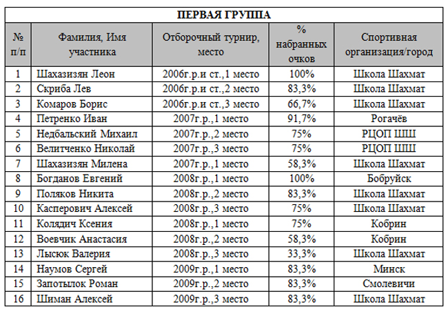 • мальчики и девочки, занявшие 1 – 3 места в отборочных турнирах «ПРОХОДНАЯ ПЕШКА для детей 2006 г.р. и старше», «ПРОХОДНАЯ ПЕШКА для детей 2007 г.р.», «ПРОХОДНАЯ ПЕШКА для детей 2008 г.р.», мальчики, занявшие 1 – 3 места в отборочном турнире «ПРОХОДНАЯ ПЕШКА для детей 2009 г.р.» – ПЕРВАЯ ГРУППА;