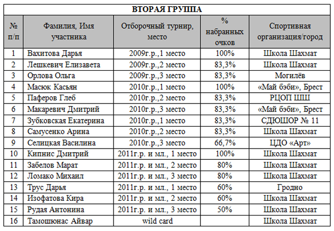 • девочки, занявшие 1 – 3 места в отборочном турнире «ПРОХОДНАЯ ПЕШКА для детей 2009 г.р.», мальчики и девочки, занявшие 1 – 3 места в отборочных турнирах «ПРОХОДНАЯ ПЕШКА для детей 2010 г.р.», «ПРОХОДНАЯ ПЕШКА для детей 2011 г.р. и моложе» – ВТОРАЯ ГРУППА.