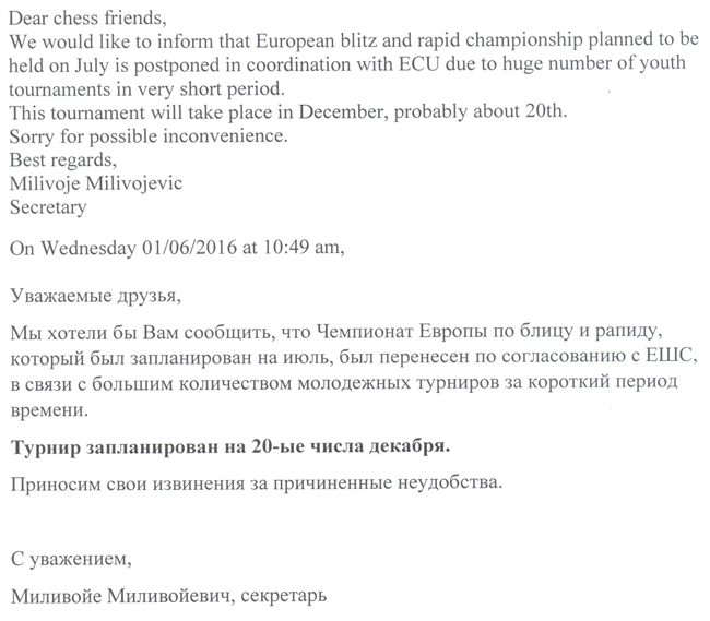 На адрес ОО «БФШ» пришло письмо об изменениях срока проведения Чемпионата Европы по быстрым шахматам и блицу в Сербии. Оригинал с переводом представляем Вашему вниманию: