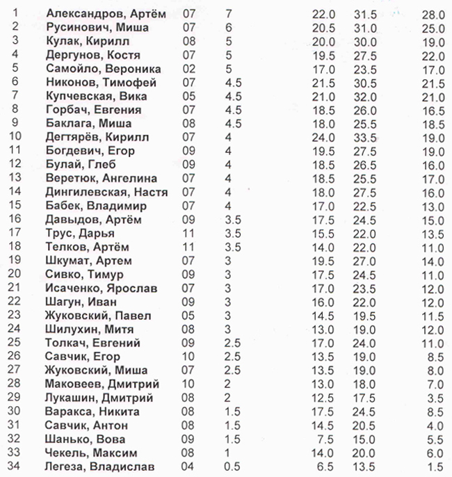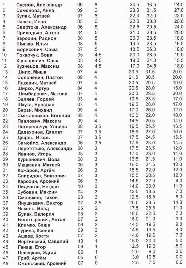 С 1 по 3 июня на базе Дворца творчества Гродно прошли соревнования по шахматам, посвященные Дню защиты детей. В программе соревнований было 2 турнира: начинающих и 4 разрядов.Приятно удивила всех Семенова Анна (2009 г.р., тренер Алесандрович М. А.), которая набрала 6 очков из 7, боролась на равных с более опытными соперниками.