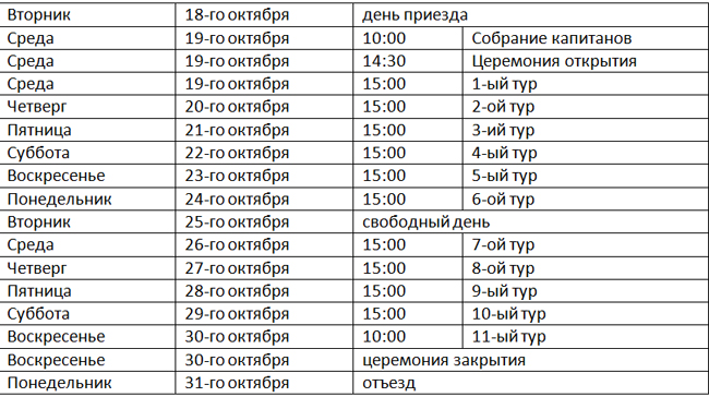 * Система тай - брейк: (а) результаты личных встреч между разделившими место игроками (только в том случае, если эти игроки играли друг с другом), (b) усеченный Бухгольц, (c) система Бухгольца, (d) большее количество партий,сыгранных черным цветом, (e) большее количество побед