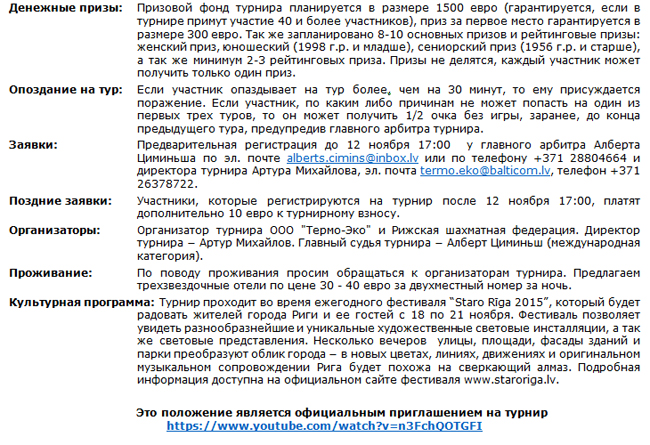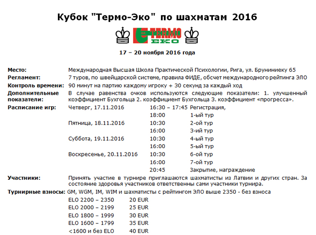 С 17 по 20 ноября в Риге пройдет международный кубок по шахматам "Термо-Эко - 2016". Призовой фонд - 1500 евро, контроль времени 90 минут на партию каждому игроку + 30 секунд за каждый ход.