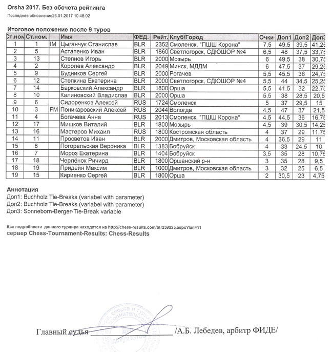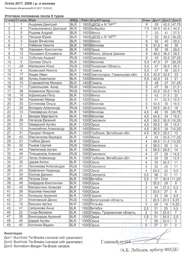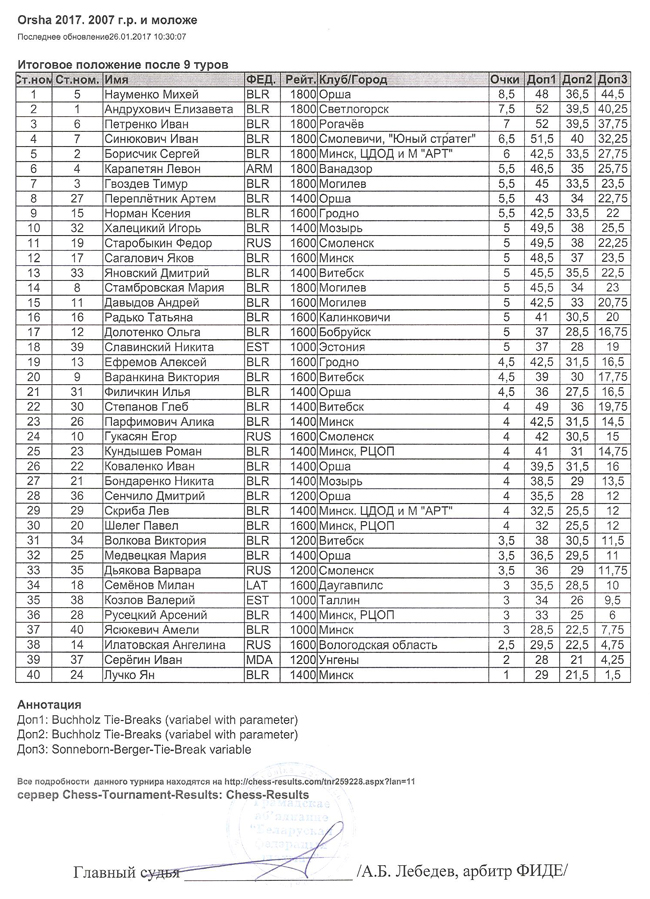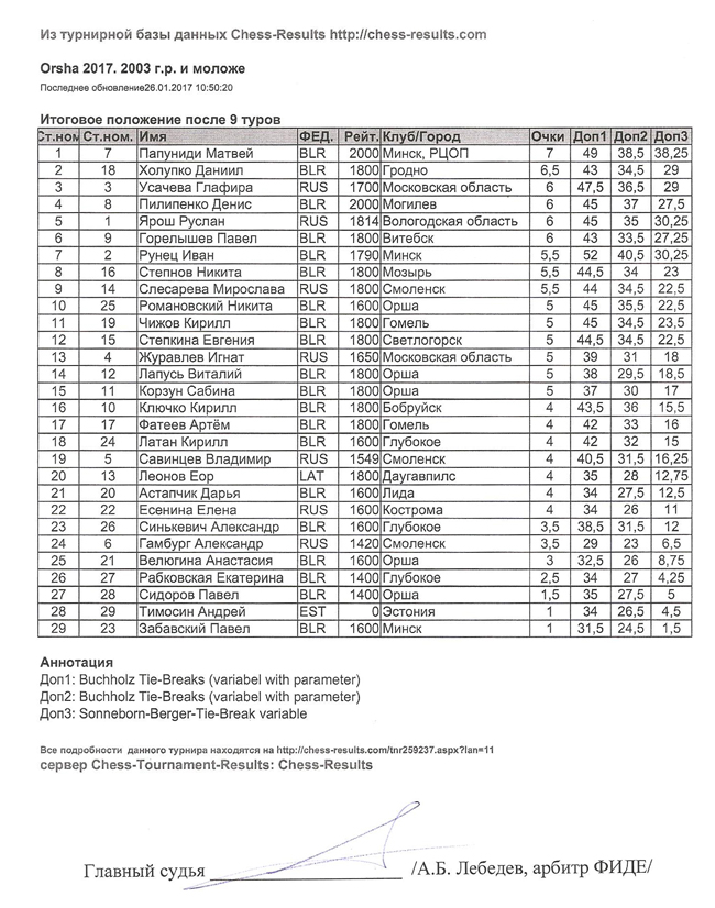 26 января 2017 года в гостеприимном ледовом дворце г.Орши завершился XV международный шахматный фестиваль "Орша-2017". Все итоговые результаты турниров