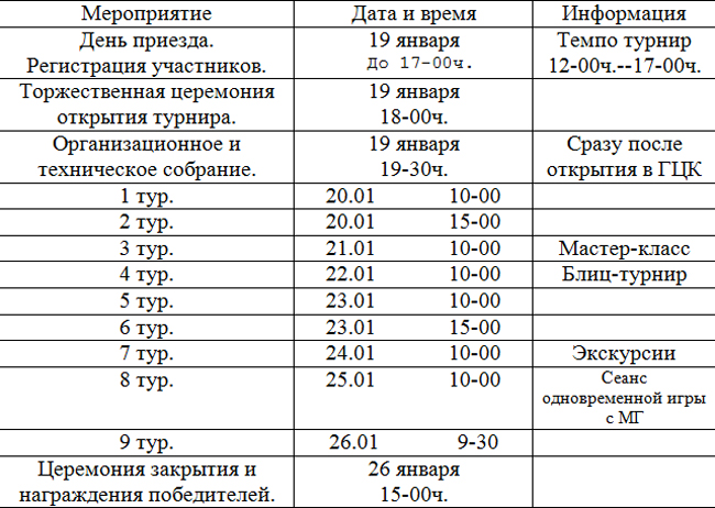 Торжественное открытие турнира в 18.00 в Оршанском городском центре культуры, расположенном по ул. Ленина, 27. После окончания церемонии открытия состоится организационное и техническое собрание судейской коллегии, представителей команд и участников турнира. Жеребьёвка турнира с нормой балла ММ ( А )