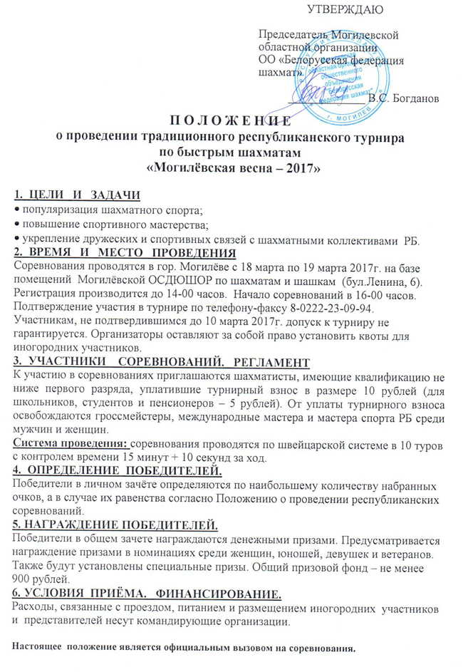 С 18 по 19 марта 2017г. на базе помещений Могилёвской ОСДЮШОР по шахматам и шашкам (бул.Ленина, 6) пройдет традиционный республиканский турнир по быстрым шахматам "Могилевская весна - 2017". В этот раз турнир будет необычным.Во-первых значительно увеличивается призовой фонд, он составит не менее 900 рублей, реально будет даже несколько больше. Кроме призов победители получат памятные медали и дипломы. Предусмотрено награждение в номинациях и специальные призы.