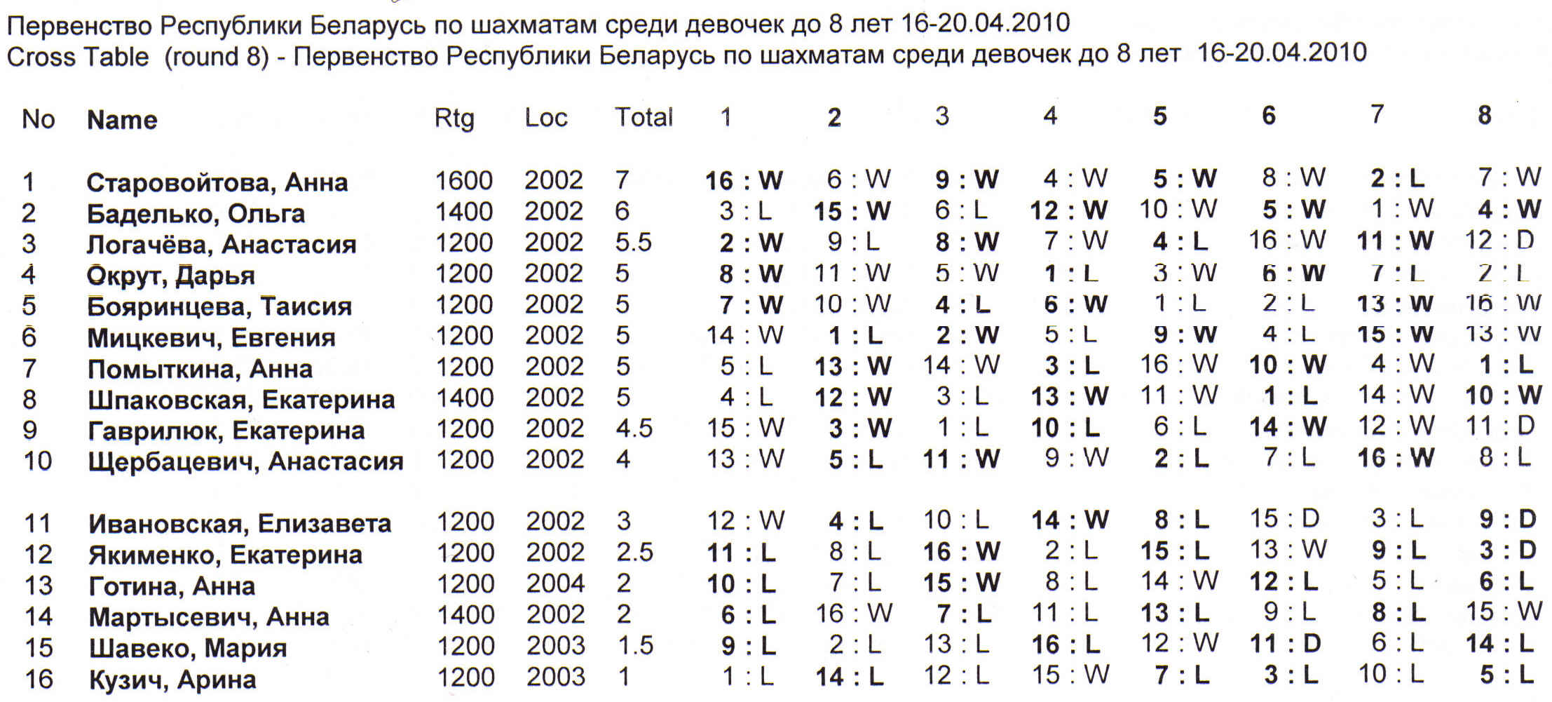 Чемпионкой Беларуси среди девочек до 8 лет 2010 года стала Анна Старовойтова (7 очков из 8). Серебрянным призером — еще одна могилевчанка Ольга Баделько (6 очков). А обладательницей бронзовой награды стала юная жительница Гомеля — Анастасия Логачева (5,5).Поздравляем!