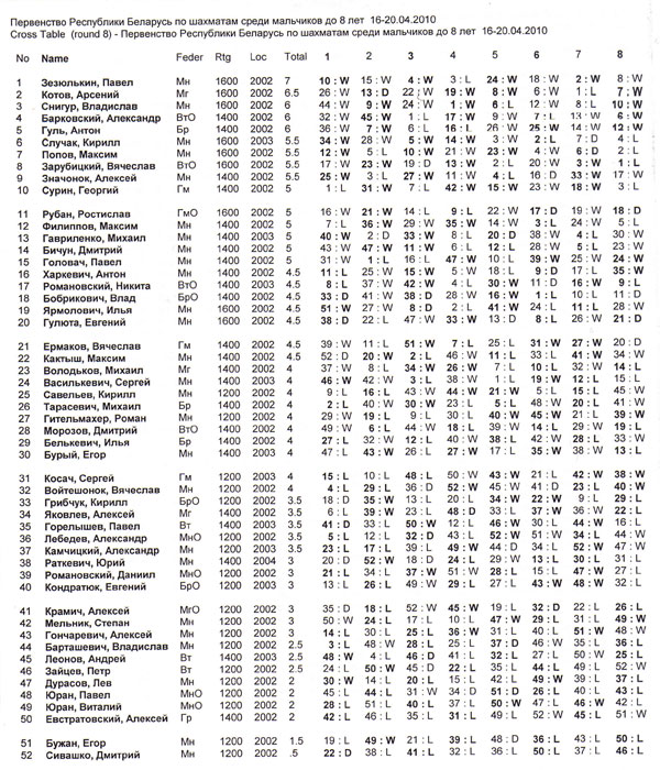 5-дневный 8-туровый марафон позади и сегодня уже стали известны имена призеров самых юных чемпионов Беларуси 2010 года — победителей Первенств в возрасте до 8 лет