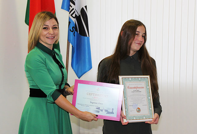 Началось общее собрание с торжественного вручения благодарности от Министерства спорта и туризма Республики Беларусь победительнице Чемпионата Европы в Румынии среди девушек до 16 лет Ольге Баделько, а также сертификата от ОО "Белорусская федерация шахмат" на сумму 3000 белорусских рублей.