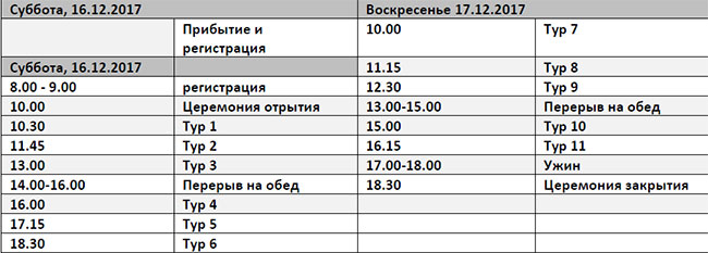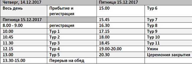 бесплатное размещение (двухместные номера) в официальном отеле соревнований с 14 по 17 декабря 2017 будет предоставлено 11-20 игрокам с высоким рейтингом, которые зарегистрируются не позднее 26 ноября 2017;