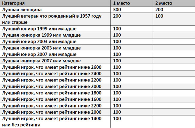бесплатное размещение (одноместный номер) в официальном отеле соревнований с 14 по 17 декабря 2017 будет предоставлено самому игроку, который имеет самый высокий рейтинг, который зарегистрируется не позднее 26 ноября 2017;