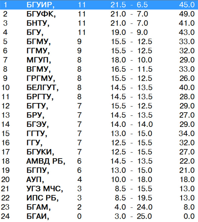 6 апреля в столичной СДЮСШОР №11 завершилась Универсиада по шахматам среди вузов Республики Беларусь. Сразу 4 команды набрали одинаковое количество очков, лишь дополнительные показали определили победителей и призеров.