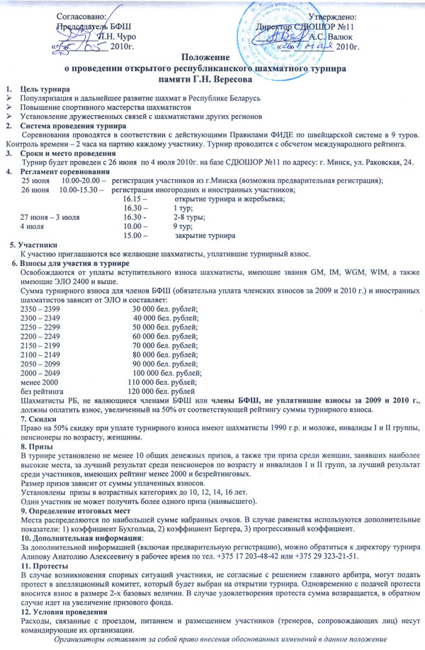 С 26 июня по 4 июля в столичной СДЮШОР-11 пройдет открытый республиканский шахматный турнир памяти Г.Вересова. К участию приглашаются все любители шахмат.
