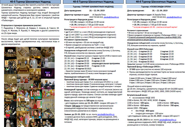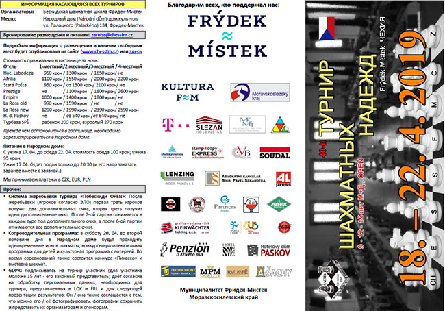 С 18 по 22 апреля наши чешские коллеги приглашают белорусских шахматистов на 40-й турнир Шахматных Надежд в Фридек-Мистек.