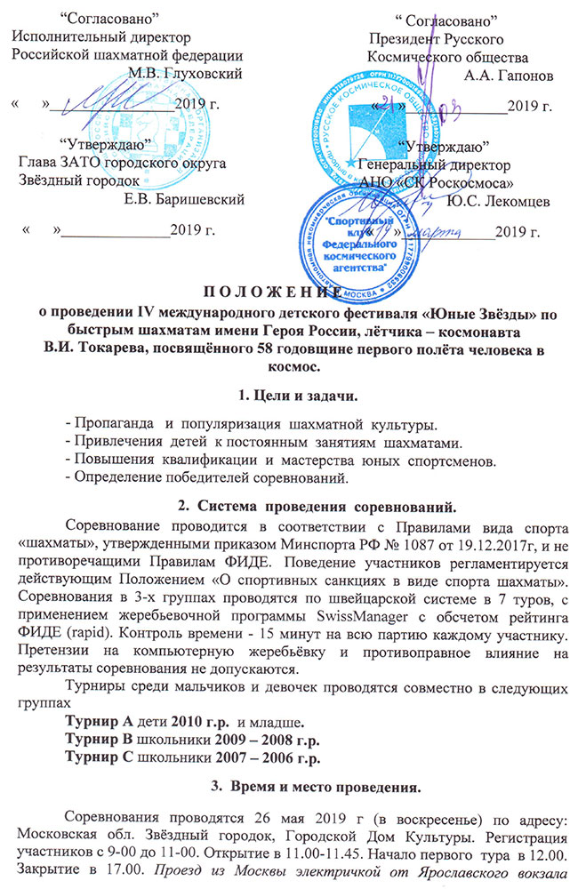 Спортивный клуб Роскосмоса и Администрация Звёздного Городка приглашают юных шахматистов 2006 г.р. и младше принять участие в 4-м международном детском фестивале по быстрым шахматам «Юные Звёзды», имени Героя России, лётчика – космонавта В.И. Токарева, посвящённого 58-й годовщине первого полёта человека в космос.