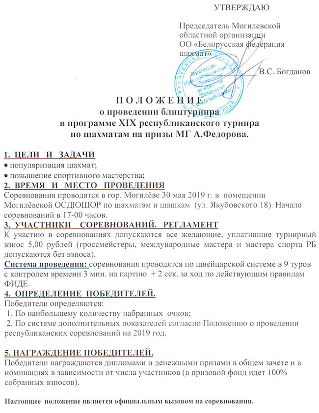 30 мая в помещении Могилевской ОСДЮШОР по шахматам и шашкам в рамках XIX республиканского турнира на призы мг А.Федорова пройдет блицтурнир.