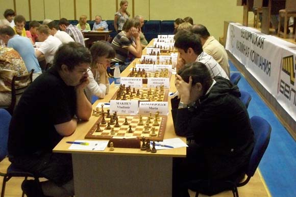 В поисках перевеса Халифман доигрался до такой вот позиции. У черных уже достаточно серьезное преимущество — а потому предложение ничьей от них прозвучало как хороший подарок.Сработала магия имени — напротив же "сам Халифман"! Александр благородно не стал искать в этой позиции того, чего в ней нет — и в гроссмейстерских рядах образовалась первая пробоина. Тут же случилась вторая — уставший Юрий Тихонов не стал играть на победу эндшпиль "ладья против коня" и пешек 3 на 4. Ну а Игорю Люцко просто повезло — в ничейной позиции его соперник Дмитрий Полещук не обратил внимание, что после сделанного хода часы продолжили идти, и просрочил время. А самая серьезная неудача подстерегла чемпиона Беларуси 2010 Евгения Подольченко: