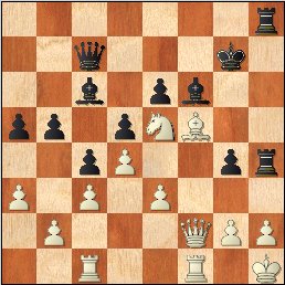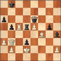 Совершенно фантастическая позиция — белые, похоже, не вышли из дебюта. Сейчас решало неожиданное 27 Qc6! И на 28.Qxb3 — dxe3! 29.Rc1 e2+!-+. Сделанный в партии ход 27 Rxd5 перевеса не выпустил, но жизнь черным слегка осложнил. 28.Qxb3 Qe6 29.Rc1+ Kb8 30.Bf4 d3 31.Kd2 g5! 32.Rc5